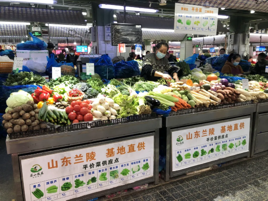 随后,记者来到江南菜场,春节期间,这里的出摊率也在95%左右。在一家经营山东兰陵直营菜的蔬菜摊位前,负责人毛玉聪告诉记者,“我们春节期间不断供,保证每天都有新鲜蔬菜从山东基地运送到此。由于是产地直销,因此价格比外面便宜15%-20%左右,让市民买到放心菜、实惠菜。”