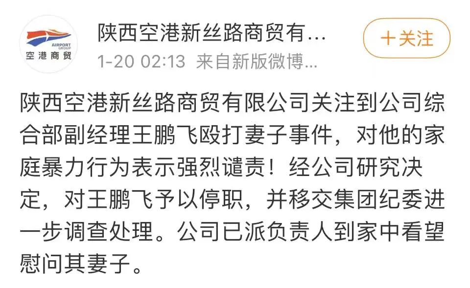 陕西空港新丝路商贸有限公司关注到公司综合部副经理王鹏飞殴打妻子事件,对他的家庭暴力行为表示强烈谴责!经公司研究决定,对王鹏飞予以停职,并移交集团纪委进一步调查处理。公司已派负责人到家中看望慰问其妻子。