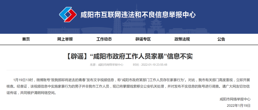 1月19日晚,咸阳市网络举报中心发布辟谣信息,表示该视频信息中实施家暴行为的男子并非咸阳市市工作人员: