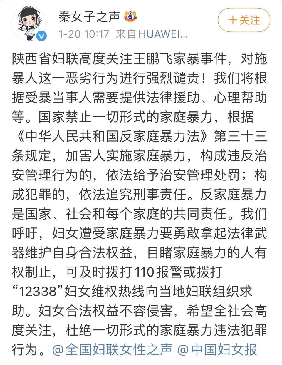 20日下午,陕西省妇联发声,表示高度关注王某飞家暴事件,对施暴人这一恶劣行为进行强烈谴责!并表示将根据受暴当事人需要提供法律援助、心理帮助等。