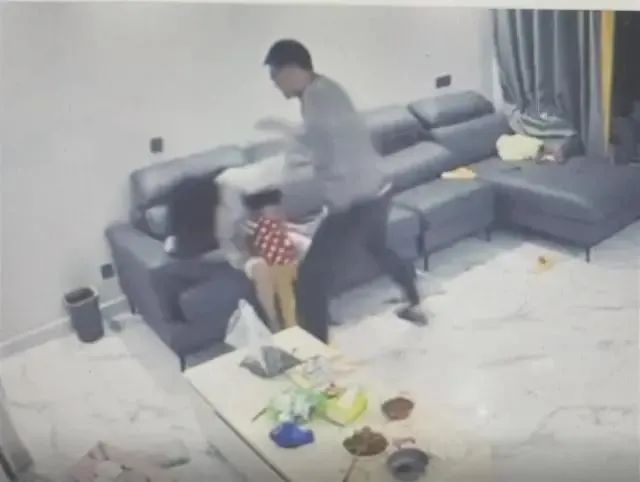 再看孩子,正在大哭,并喊叫“妈妈呀!”孩子被红衣老妇人扶起来并带走,而此刻,女子被压在沙发的缝隙之间殴打,红衣老妇人并不再做任何劝解,而是收拾了桌子上的饭碗带着孩子走了。画面中,女子依然被男子压着暴打。