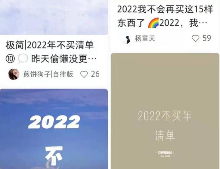“不买年”是指在一定时间内,对自己的消费行为作出限制,不买不需要的东西,持续时间从一周到一年不等。小红书上,一位博主将“不买年”挑战的购买原则总结为:是否特别喜欢,是否一定要买,是否适合自己,思考使用率和刚需性,闲置专卖。新年伊始,很多年轻人在社交平台上写下自己的新年计划,“不买年”就是颇具人气的关键词之一。