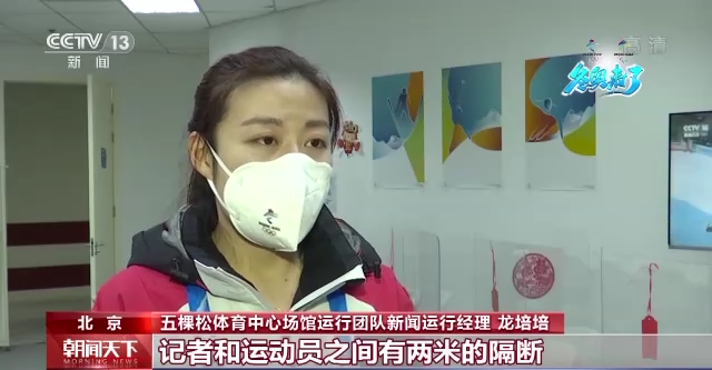 五棵松体育中心场馆运行团队新闻运行经理龙培培:从1月27日我们的官方训练开始,大概我们整个场馆媒体中心,接待了有超过80名的中外记者。在混合区我们用防疫隔板,记者和运动员之间有两米的隔断,在这中间只有志愿者从中为双方服务。也就是说记者有采访需求的时候,可以将他的录音笔递到志愿者手上的托盘上,全程都是无接触的。当记者离场之后,我们的混合区会进行一次封闭,进行一次全面的消毒。