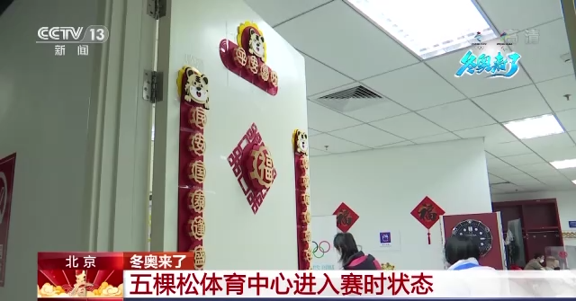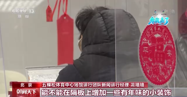 五棵松体育中心场馆运行团队新闻运行经理龙培培:恰逢中国年,所以我们就考虑能不能在隔板上增加一些有年味的小装饰,尤其是给外国记者们体验一下中国年味的文化特点。
