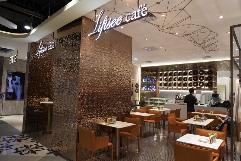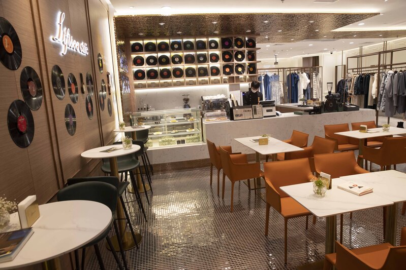 Lifisee Café 咖啡时光的创始人是一个黑胶唱片收藏家,店里共陈设了7000张黑胶唱片,有的放在格子里,有的贴在墙上。咖啡吧台的背景墙面也被装饰成满满的唱片墙,一台复古唱片机正播放着蓝调音乐。用餐区的隔壁就是女装售卖区了。