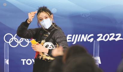 2月8日,中国选手谷爱凌在赛后新闻发布会上。 新华社记者 兰红光摄