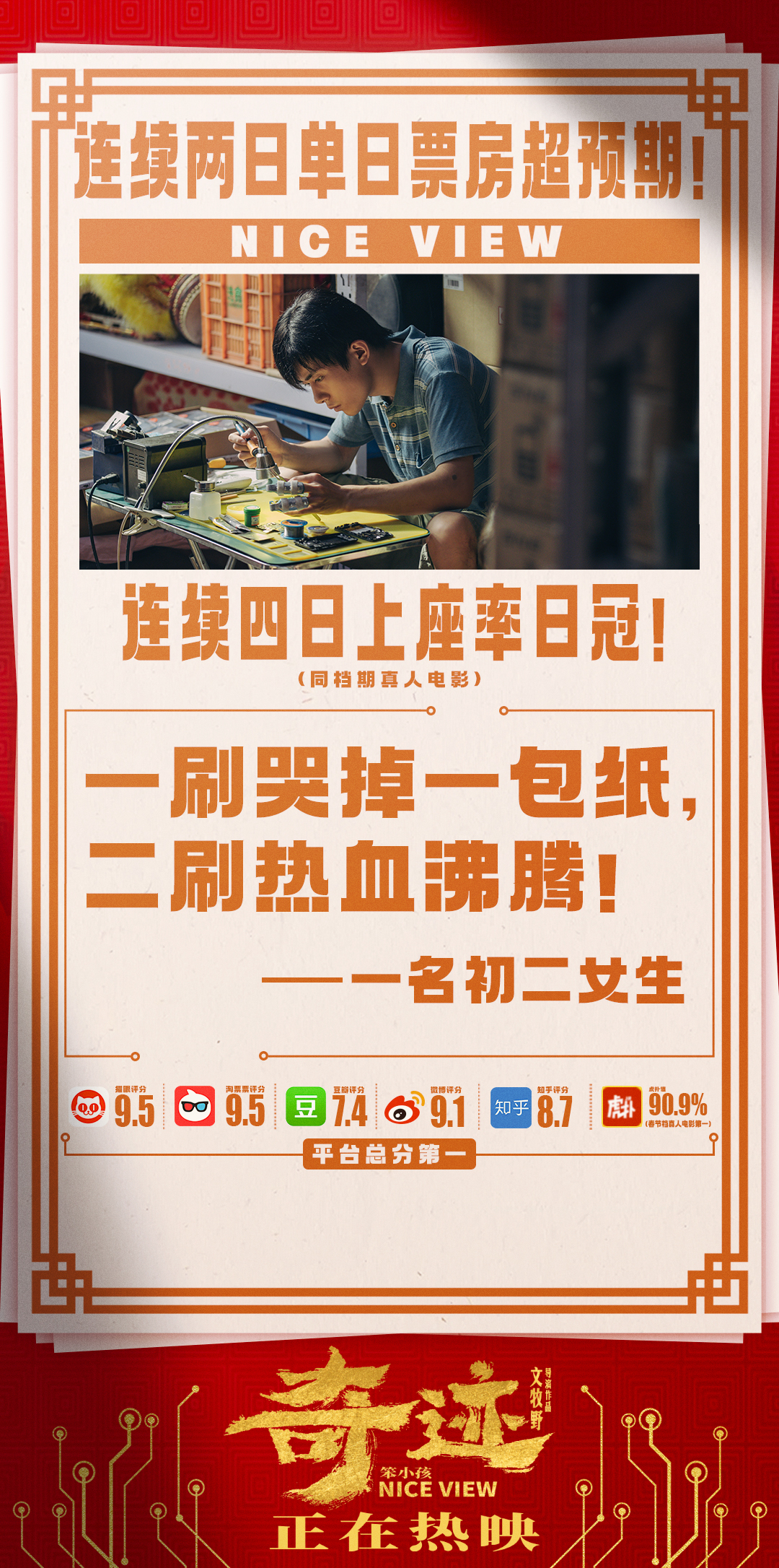 而影片上映第十天,连续四日蝉联同档期真人电影上座率日冠,票房占比、排片占比持续上涨,全平台口碑总分稳居首位。截止目前累计票房破9亿,并发布“风雨无阻”版兄妹海报,通过景浩、景彤彼此支撑相互照顾的温馨场景,展现兄妹之间相依为命的至爱亲情。影片正在全国热映中。