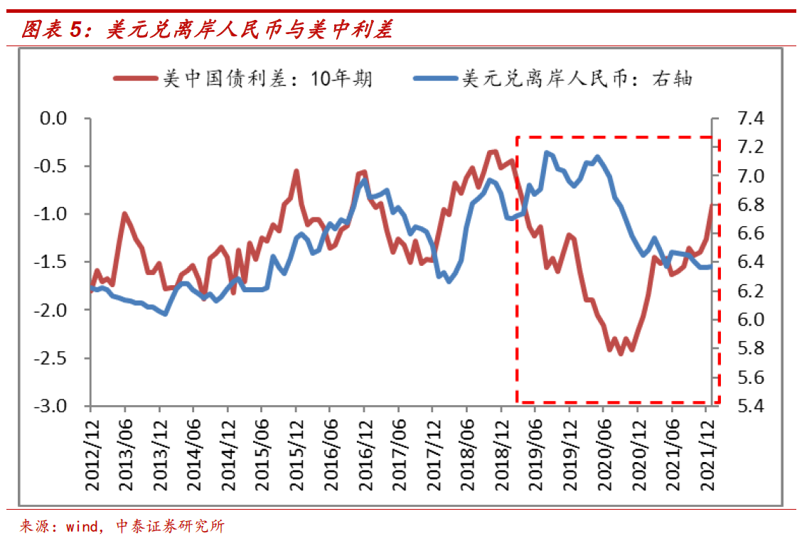 观察美元对离岸人民币与美中利差的关系可以发现,2018年之后两者走势就开始背离了。其背后原因值得分析。