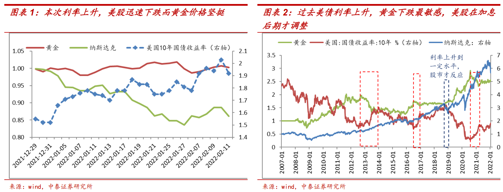 本次美联储收紧预期形成、美国利率开始抬升后,美国股市迅速下跌,黄金却走势坚挺,这并不寻常。过去在收紧预期形成初期、利率刚开始上升时,黄金会更敏感。在利率上升至较高位置,甚至接近利率上升周期的尾声时,美股才调整幅度较大(见图表2)。