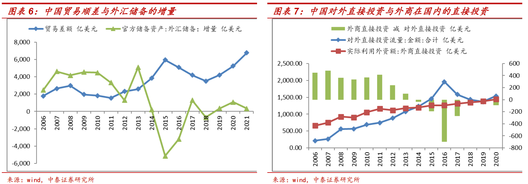 首先,中国加大对外投资力度使得外汇储备规模停止了快速上升,这可能降低人民币对美元汇率对中美利差的敏感性。自2014年以来,在“一带一路”实施下,中国对外直接投资快速增加,甚至超过外商在国内的直接投资。这使得虽然贸易顺差持续保持高位,但中国的外汇储备在2014年后停止了快速上升的趋势。