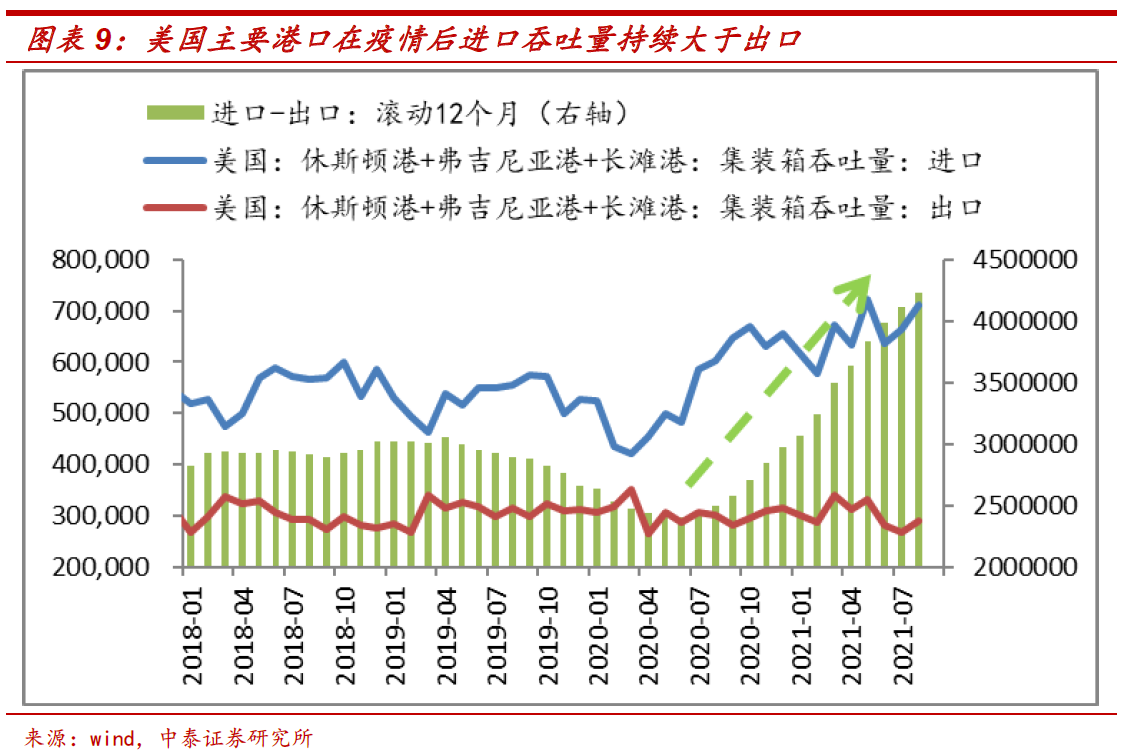 供应链恢复可能比预期的慢。之前大部分观点都认为,美国物价上涨是因为疫情导致的供应链问题,随着疫情封锁放松,通胀会比较快消退。但我们在2021年10月21日发布的《新冠流感化了吗?全球供应链恢复还要多久》报告中分析了全球主要港口的进、出口吞吐量,发现大多数国家的进、出口吞吐量都在正常范围内波动,只在2020年上半年疫情期间造成了较明显的波动,随后向正常水平恢复。只有美国在疫情发生以来,进口吞吐量持续大于出口量,这会直接造成空集装箱的堆积和打破全球航运网络的平衡。因此推测,美国在疫情后给居民直接大额补贴对全球供应链的影响可能更大。因为直接大额发钱会造成美国需求超预期爆发(如房地产的火爆),且会降低工人的就业意愿,导致供给的复苏明显赶不上需求的爆发。