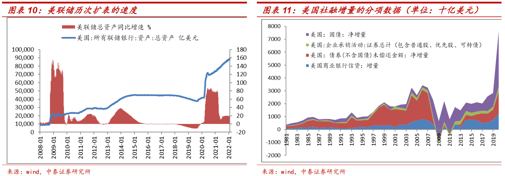 “撒钱”的影响远大于QE。在谈论美国货币到底放了多少水的时候,大多数人都聚焦在QE的规模。在中泰时钟的分析框架下,将货币政策分为货币宽松和信用扩张两个环节。货币宽松刻画中央银行对金融机构的宽松力度,它对利率和资产泡沫影响最直接。信用扩张则刻画整个经济体中的信用创造,它对实体经济的总需求和物价的影响是决定性的。