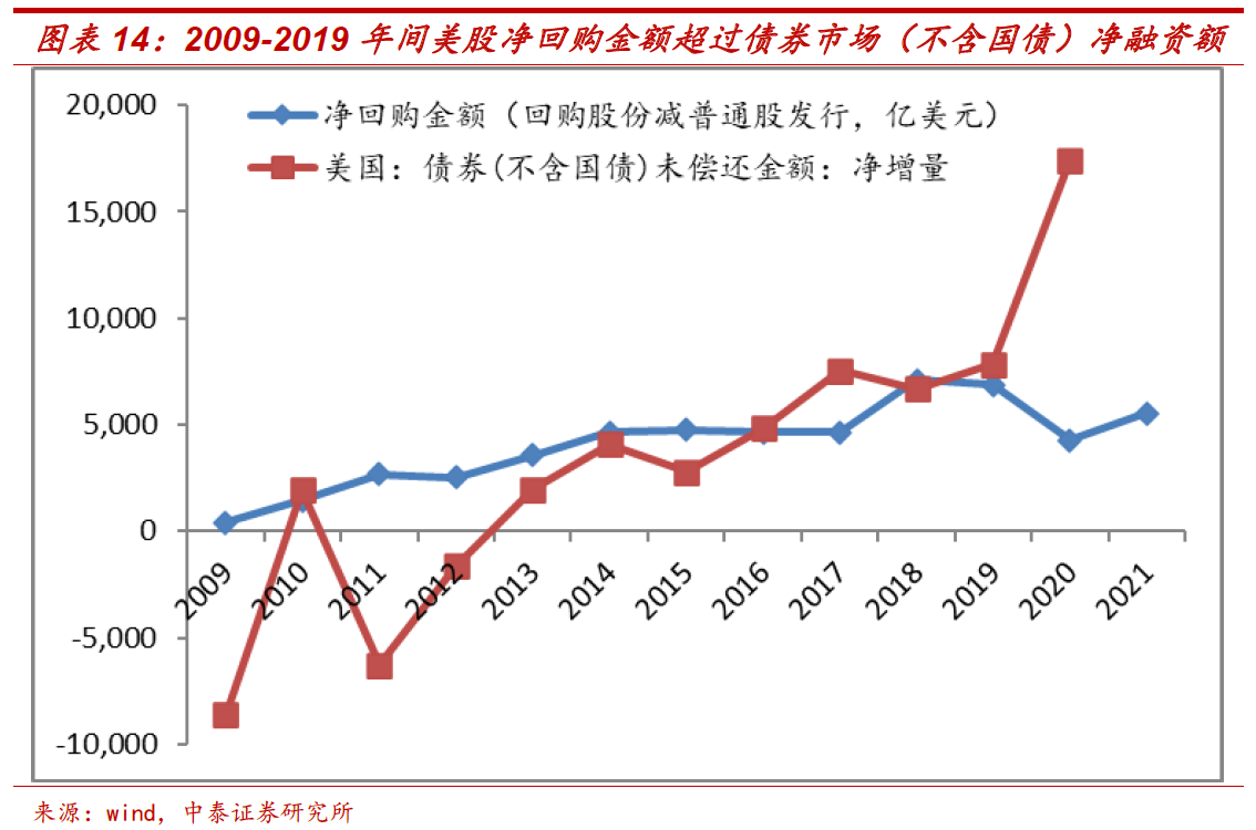 2009年至2019年间,美股净回购金额(回购股票金额减普通股发行融资金额)竟然大于美国债券市场除国债外的净融资额。如果把回购股票并注销视作股票融资的逆过程,则股票回购完全抵消了债券市场(不含国债)的融资作用。这或许很好地解释了为什么低利率对美国实体经济的刺激作用不明显——因为对新增社融几乎没有贡献。2020年在QE加“撒钱”的政策下,美国债券市场除国债外的净融资额才大幅上升。