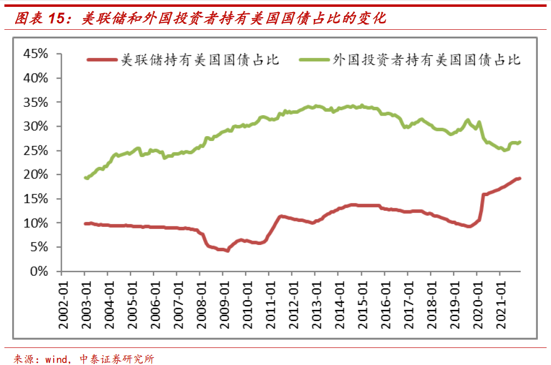 首先,美国利率将上升较快。在美国国债持有者中,美联储的占比不断提高,而外国投资者占比不断下降。美联储已成为美国国债的重要持有者,而美国国债对外国投资者的吸引力又在降低,一旦QE退出和实施紧缩政策,美债的购买需求可能大幅下滑,导致美债利率快速上行。美债上升的幅度和时间取决于通胀压力何时缓解。