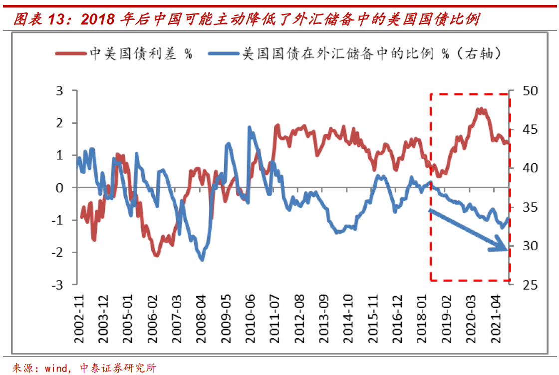 2018年后中国可能主动降低了外汇储备中美国国债的比例,这也是美元吸引力下降的重要表现。从美国国债在我国外汇储备中的比例来看,2018年前,其与中美利差负相关性明显:在中美利差较低(即美债收益率相对较高)时,倾向于增加美债配置比例;在中美利差较高时倾向于降低美债配置比例。这是比较符合市场化的配置操作。而在2018年之后,尽管中美利差有升有降,且波动较大,但中国外汇储备里美国国债比例呈现较稳的下降趋势。这或许是中国主动为之。