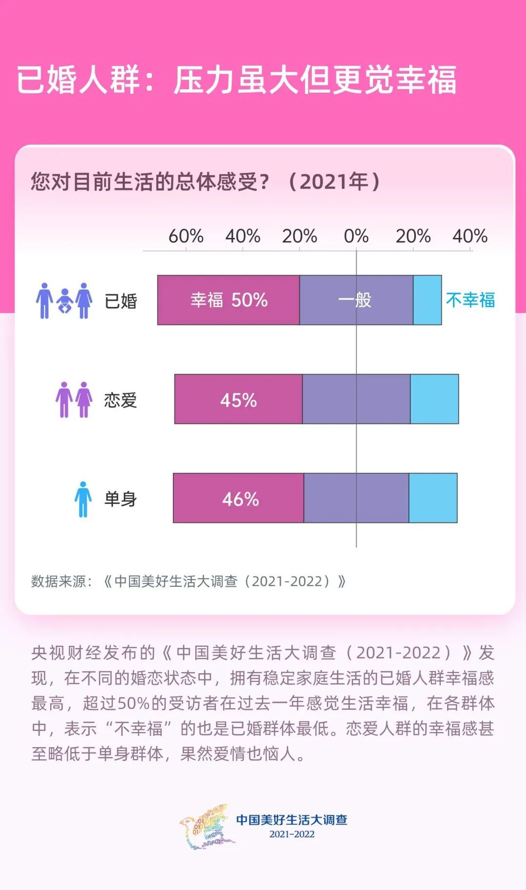 央视财经发布的《中国美好生活大调查(2021-2022)》发现,在不同的婚恋状态中,拥有稳定家庭生活的已婚人群幸福感最高,超过50%的受访者在过去一年感觉生活幸福。在各群体中,表示“不幸福”的也是已婚群体最低,恋爱人群的幸福感甚至略低于单身群体。