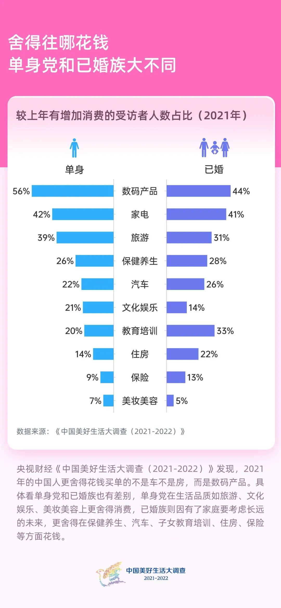 央视财经《中国美好生活大调查(2021-2022)》发现,2021年的中国人更舍得花钱买单的不是车不是房,而是数码产品。具体看,单身党和已婚族也有差别,单身党在生活品质方面,如旅游、文化娱乐、美妆美容上更舍得消费。已婚族则因有了家庭,要考虑长远的未来,更舍得在保健养生、汽车、子女教育培训、住房、保险等方面花钱。