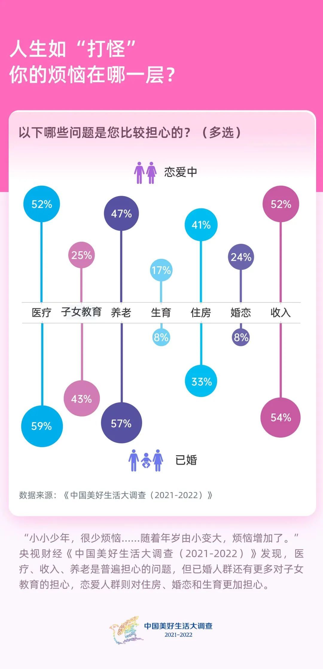“小小少年,很少烦恼……随着年岁由小变大,烦恼增加了。”央视财经《中国美好生活大调查(2021-2022)》发现,医疗、收入、养老是普遍担心的问题,但已婚人群还有更多对子女教育的担心,恋爱人群则对住房、婚恋和生育更加担心。