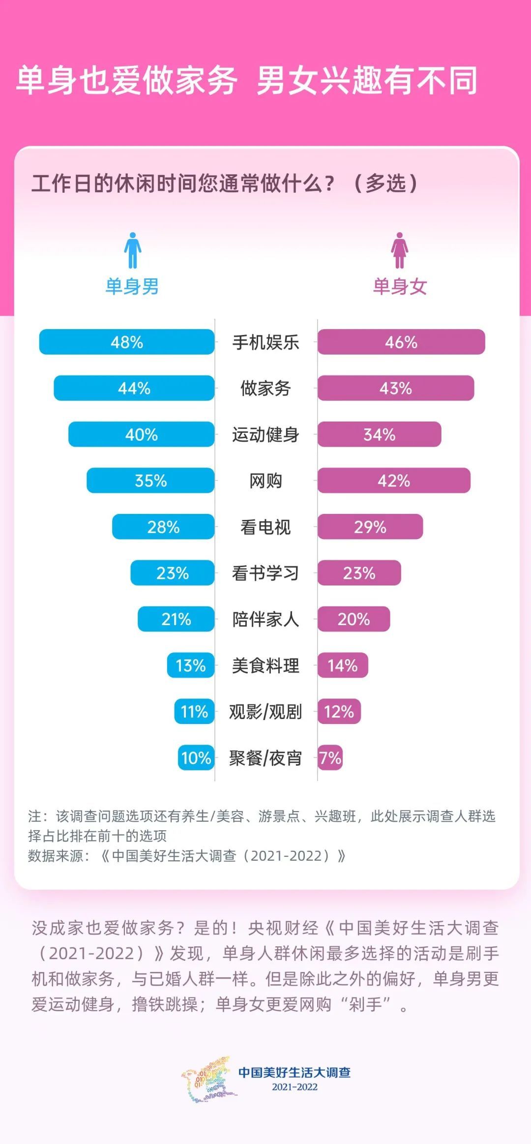 没成家也爱做家务?是的!单身人群休闲最多选择的活动是刷手机和做家务,与已婚人群一样。但是除此之外的偏好,单身男更爱运动健身,撸铁跳操;单身女更爱网购“剁手”。