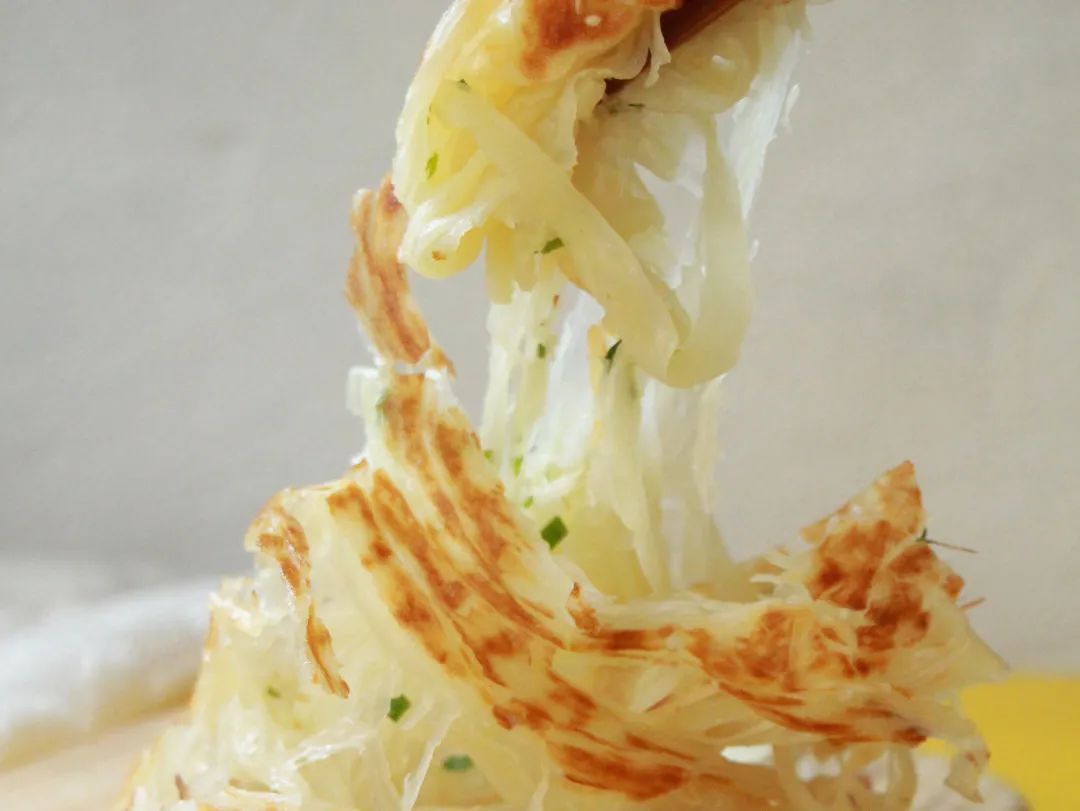刚煎出锅的饼子,金黄焦脆,外皮酥的掉渣,内里柔韧拉丝,一层一层的十分透亮,用筷子挑起,还能看到千层螺旋状!