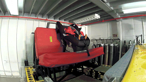 车子撞击到墙壁后,穿着羽绒服的假人被滑出了座椅,头部向下悬空挂着;然而,脱掉羽绒服的假人则牢牢地固定在座椅中,只有轻微的回弹出现,并没有被滑脱出去。