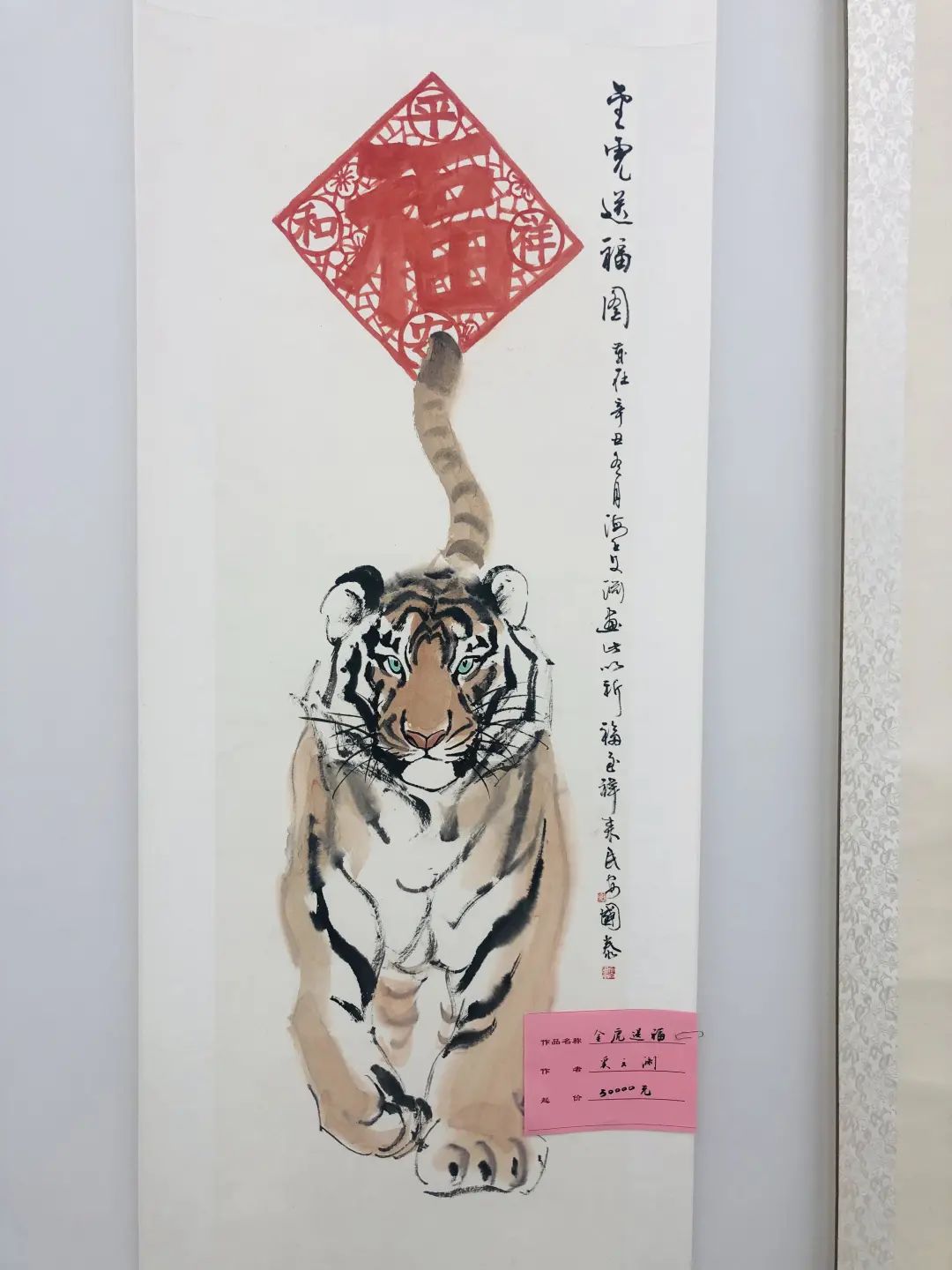 这幅《金虎送福》作品是由画家奚文渊创作而成,他擅长水墨人物、走兽,尤以水墨肖像画名世。上海八埭头书画院院长顾本建告诉记者,画家捐赠的49幅书画作品用作慈善义卖,是一种画家情怀的体现。只要事关慈善公益,画家们都愿意去做。