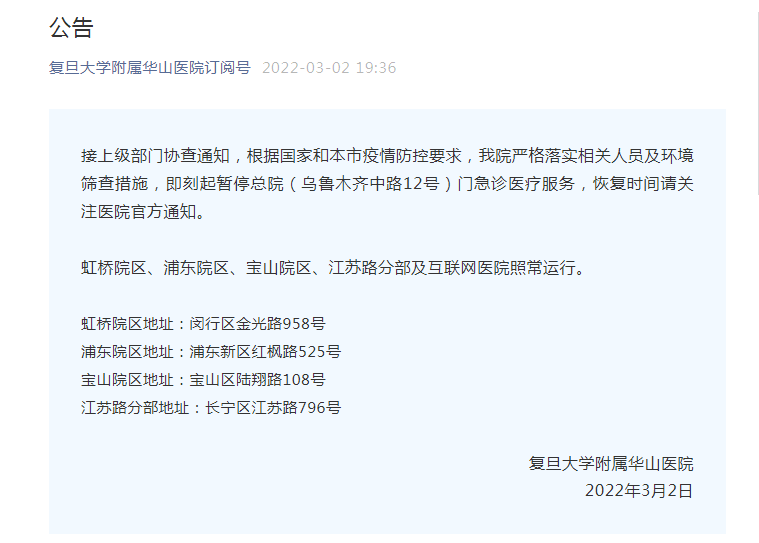 接上级部门协查通知,根据国家和本市疫情防控要求,复旦大学附属华山医院严格落实相关人员及环境筛查措施,即刻起暂停总院(乌鲁木齐中路12号)门急诊医疗服务,恢复时间请关注医院官方通知。