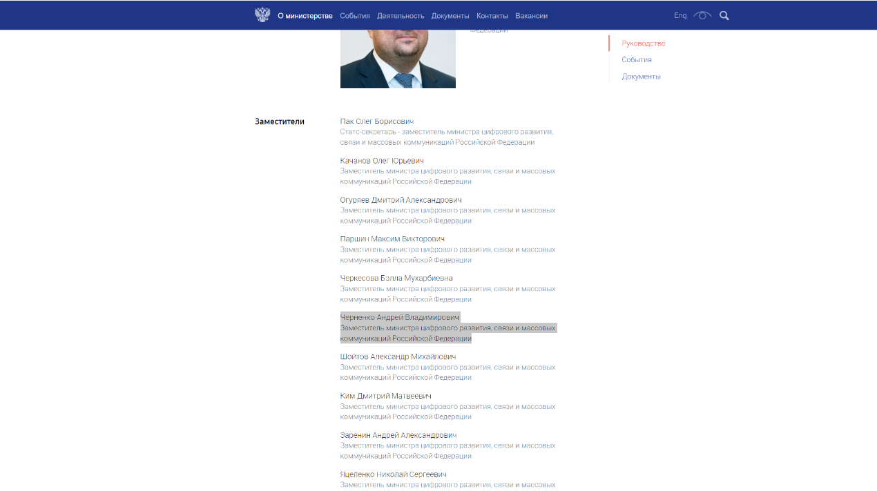 两份文件落款均为:俄罗斯联邦数字发展、电信和大众传媒部副部长A. V. 契尔年科(A . B .ЧЕРНЕНКО)。明查员检索俄罗斯联邦数字发展、电信和大众传媒部官网后证实,该部确实有一位名为安德烈·弗拉基米罗维奇·契尔年科的副部长。