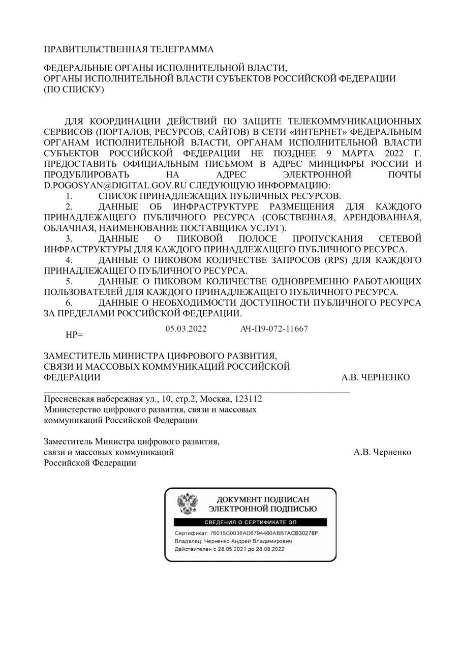第二张图片中文件内容为,执行机构应于3月9日前,提供以下信息:1. 拥有的公共资源列表。2. 每个拥有的公共资源(适当的、租用的、云、服务提供商的名称)的托管基础设施的数据。3.每个公共资源的网络基础设施峰值带宽数据。4. 每个公共资源的最高请求数(RPS)的数据。5. 每个公共资源的并发用户数峰值数据。6. 俄罗斯联邦以外有关于需要公共资源的数据。