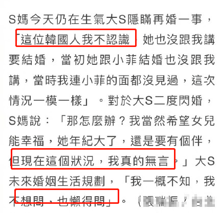 关于两人的恋情,此前台媒曝大S的妈妈似乎不是很认同,在接受采访时表示不认识这个韩国人,女儿结婚也没有通知她,虽然想祝福女儿,但是对于这个恋情她还是表示很无语。