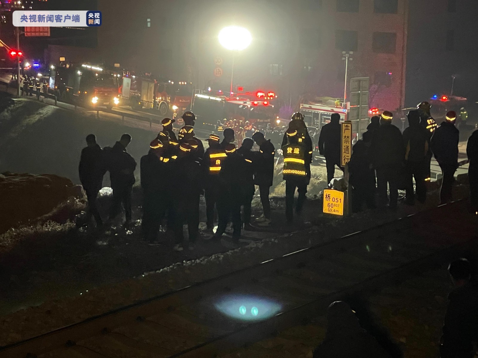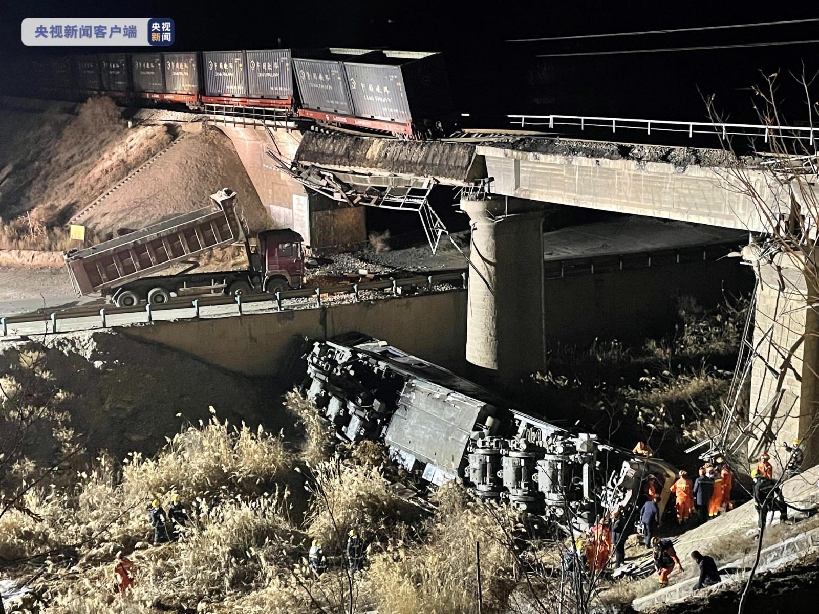 甘肃靖远一火车车头脱轨坠落 目前有3人被困