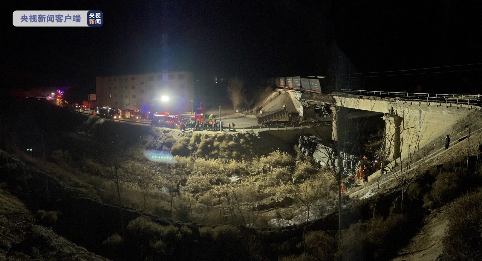 3月8日21时30分左右,甘肃省白银市靖远县糜滩镇黄河大桥附近,一辆自卸式卡车车斗撞上铁路桥桥面,导致过路火车车头脱轨坠落至公路边沟。3月9日凌晨1点,总台记者在事发现场看到,多节货车车厢仍停留在铁路桥上,铁路桥东西两端约一百米的范围内已拉起警戒线。值守民警表示,该桥已成危桥,禁止人员车辆从下穿过。而在铁路桥下,一辆自卸式卡车车斗朝上翘起,一个火车车头横卧在旁边的河道内,消防人员仍在实施救援。据现场救援人员介绍,事故发生时,车头上共有4人,除1人被救出外,还有3人仍然被困在车头中。