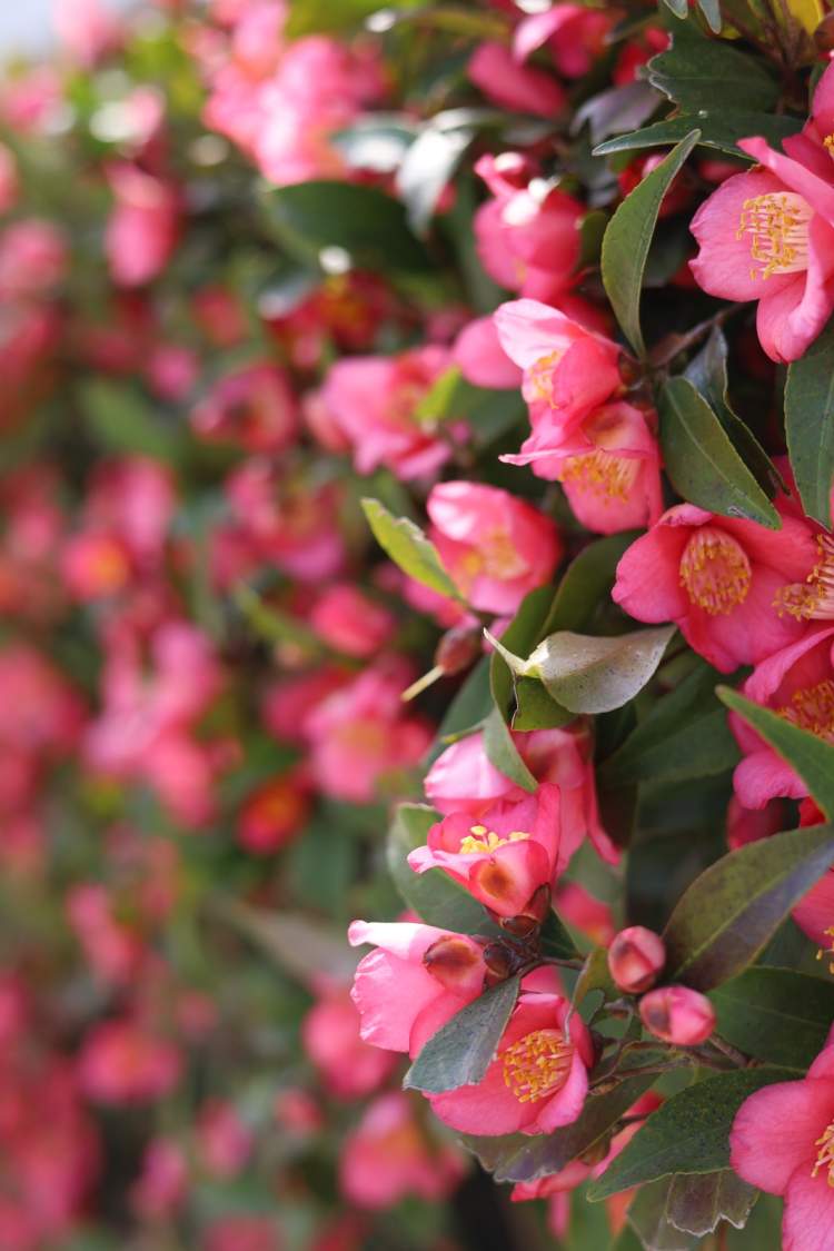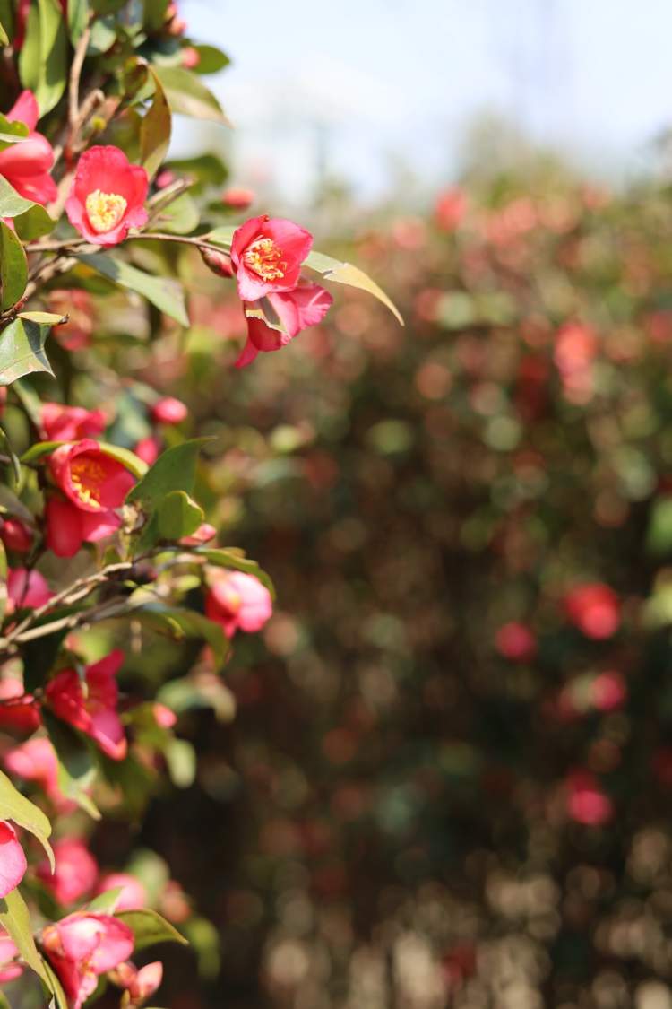 在上海植物园,主要有两处地方。一处是1号展览温室旁的束花茶花迷宫,一处是盆景园。在束花茶花组成的迷宫,品种基本上是‘枚玉’,花朵挂满枝,蜜蜂嗡嗡嗡,多得让人不敢靠近嗅探。