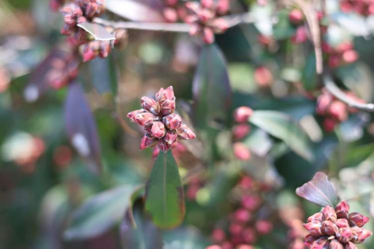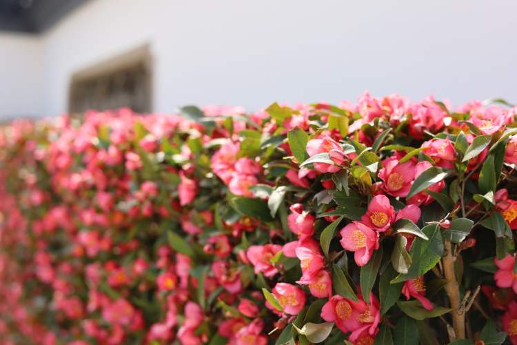 盆景园里的束花茶花更为精致可爱。主角是‘枚玉’和‘玫瑰春’,削得整整齐齐的花篱和背后的中式园林布景相映成章。上海植物园科研中心肖老师告诉周到君,它不仅可以观花,还能观叶——因为修剪频繁,茶花的叶子在生长旺盛期呈现大片的红色,非常好看。