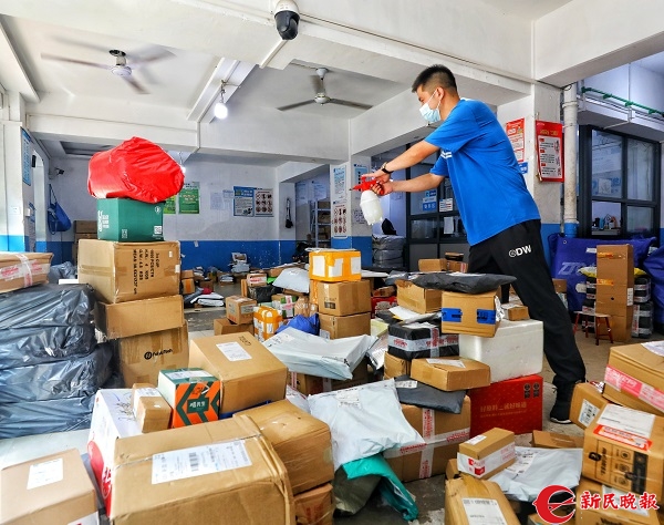 图说:快递小哥正在消杀 来源/新民晚报记者张龙 摄