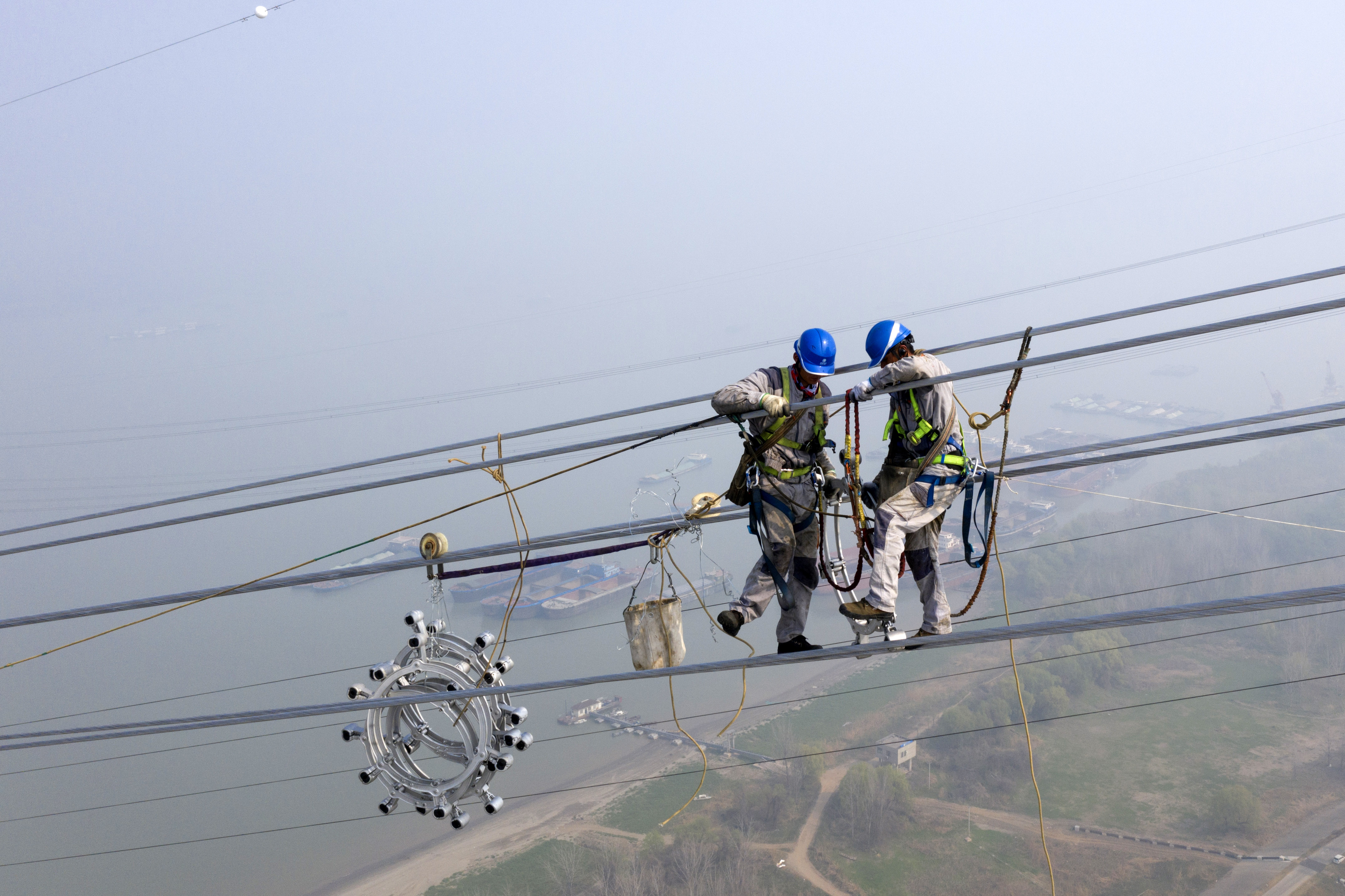 新华社照片,芜湖(安徽),2022年3月14日 特高压“白江线”安徽段长江大跨越线路贯通 3月14日,在安徽芜湖的长江边,安徽送变电工程有限公司施工人员在高空进行特高压输电线路跨江作业(无人机照片)。 3月14日,白鹤滩—江苏±800千伏特高压直流输电工程安徽段跨越长江放线工程完成最后6根导线的展放,标志着特高压“白江线”安徽段长江大跨越线路贯通。 白鹤滩—江苏±800千伏特高压直流输电工程是我国“西电东送”战略的重点工程,是促进国家能源结构调整和节能减排的清洁能源项目。工程投运后,每年输送电力将超过312亿千瓦时。 新华社发(赵献富摄)