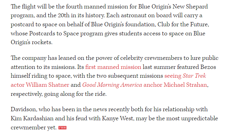 去年夏天,它的第一次载人任务是贝佐斯本人乘坐太空飞行,随后的两次任务分别是《星际迷航》演员威廉·夏特纳和《早安美国》主播迈克尔·斯特拉汉同行。