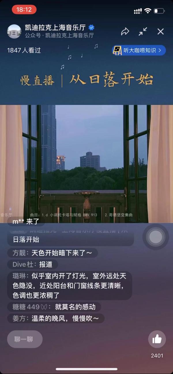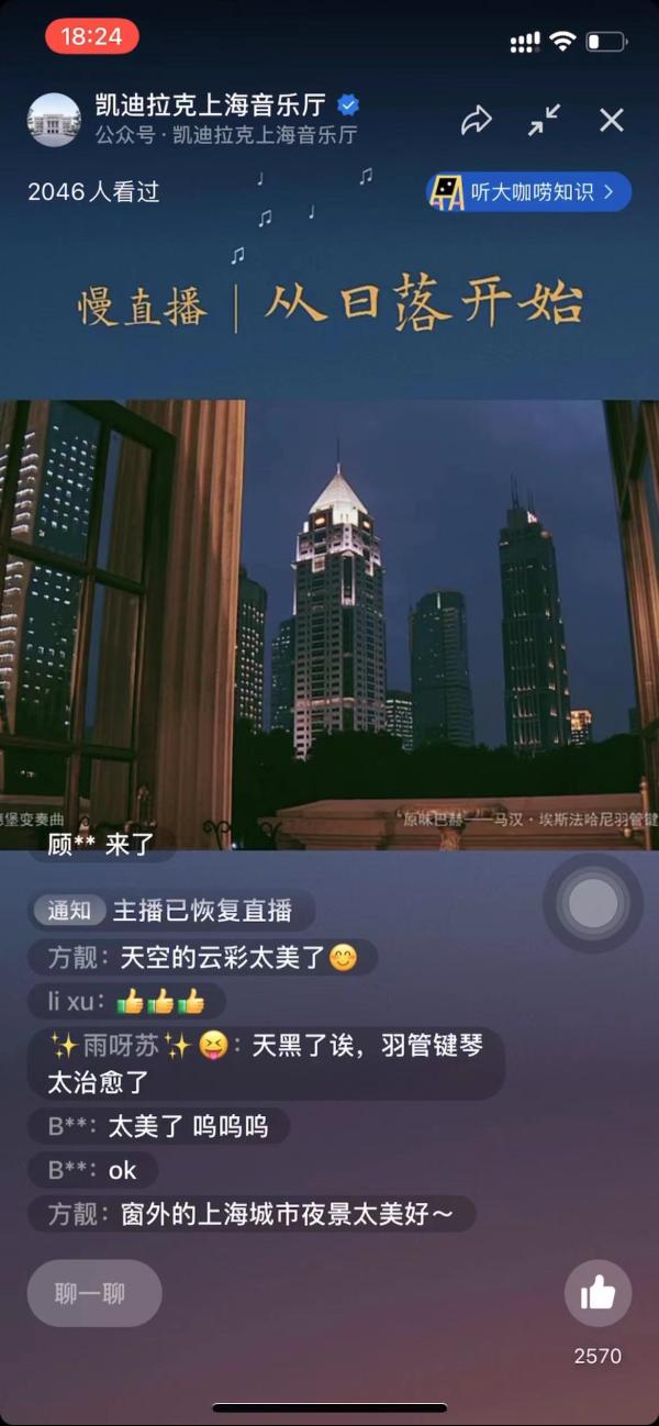 “太美了!”“治愈!”“莫名的感动……”3月19日17时04分,日落前1小时,凯迪拉克·上海音乐厅“云音乐厅”推出的全新线上产品“从日落开始——上海音乐厅绝美视角慢直播”,在上海音乐厅官方视频号和bilibili账号正式开启。