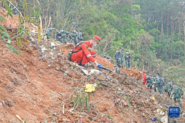 3月22日,工作人员在东航MU5735客机坠毁事故现场搜索黑匣子。
