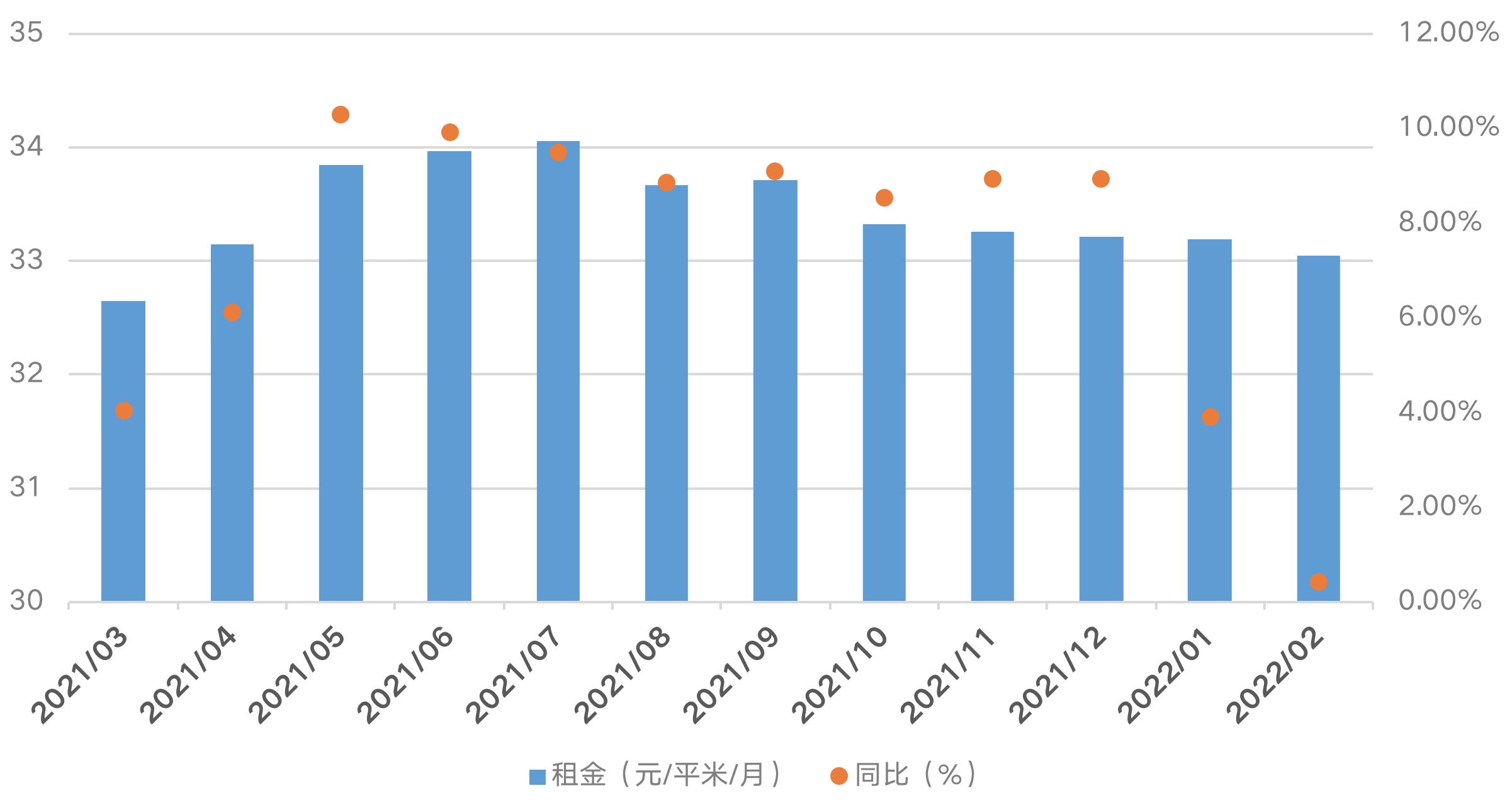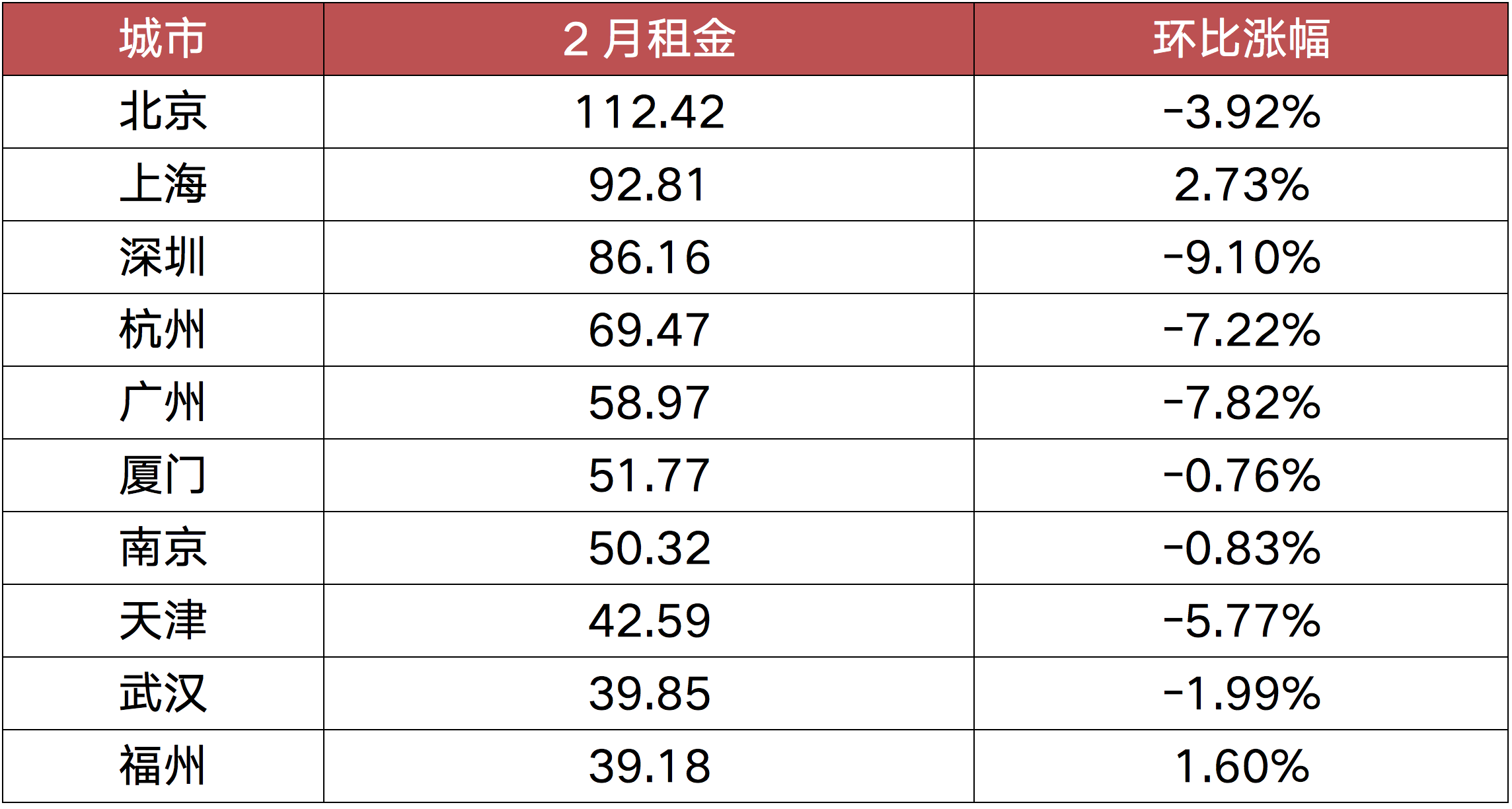 从城市来看,北京2月租金每平方米已突破百元,达到112.42元/平方米/月,成为当月全国唯一一个平均租金过百的城市,且同比涨幅领涨全国。