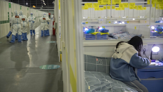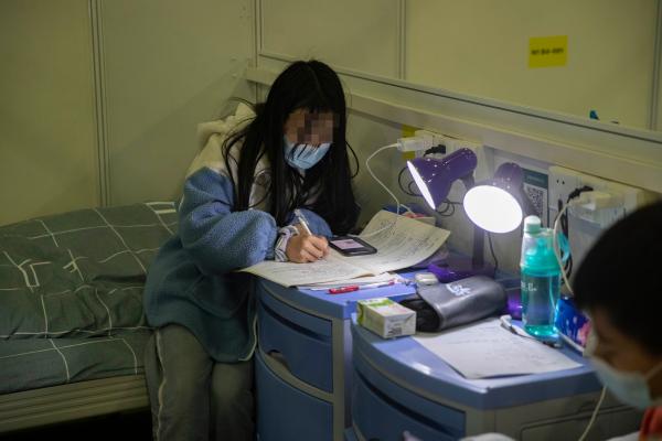 方舱里女孩深夜伏案写作业,希望疫情过去家人康复自己早日返校