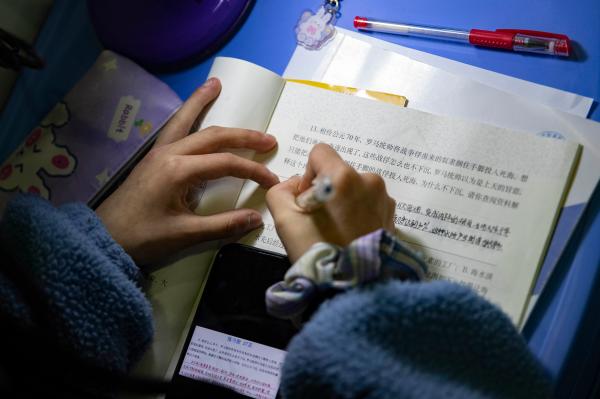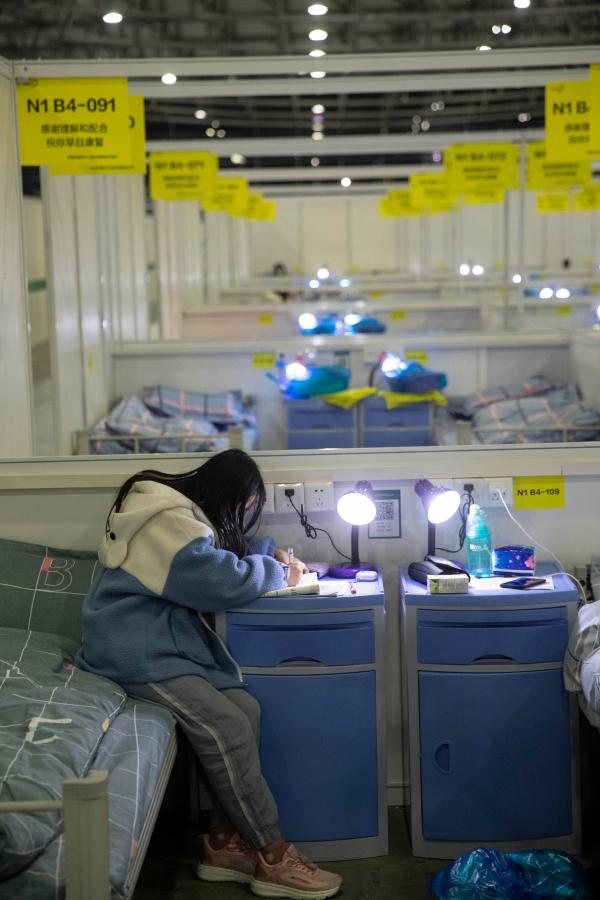 2022年4月2日22时许,在上海新国际博览中心方舱医院N1馆内,一名瘦瘦的女孩子侧身坐在床边,伏案写着作业,每写完一项就用手机拍照在线提交,丝毫不在意身边的吵杂。看到女孩子专注写作业,病区护士赶忙上前帮她调整台灯角度。