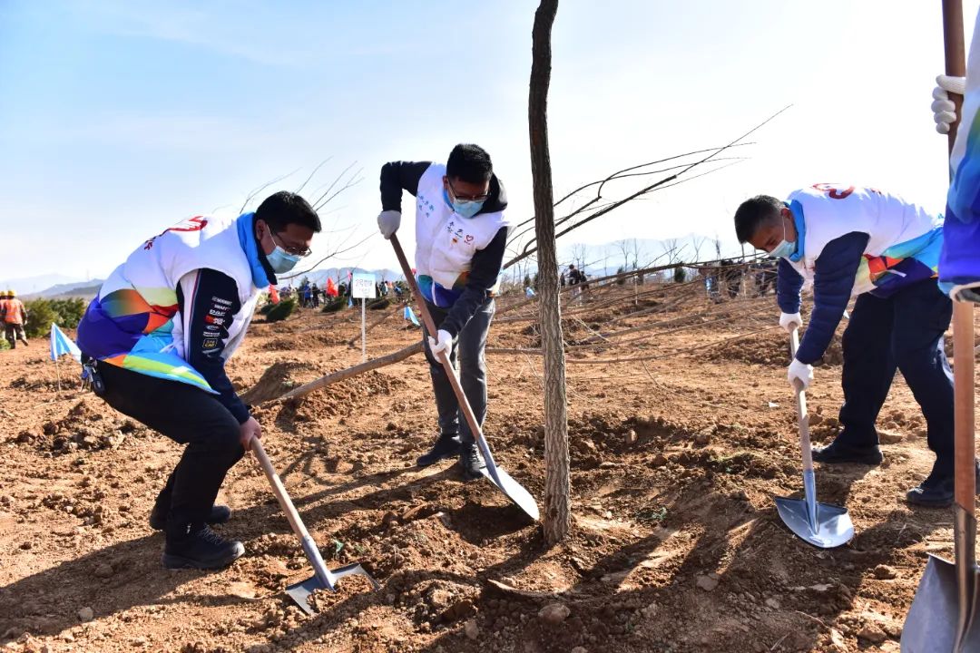 在四海镇植树活动中,志愿者们齐心协力,挖坑、扶苗、培土、浇水……细致地完成每一道工序,精心栽下一棵棵树苗。