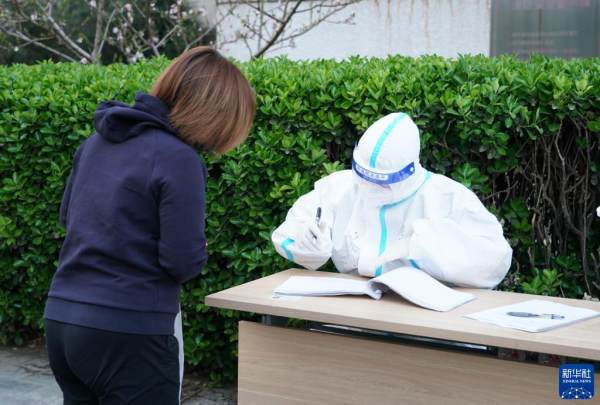 4月7日,在北京市海淀区北太平庄街道今典花园小区,工作人员登记核酸采样人员信息。