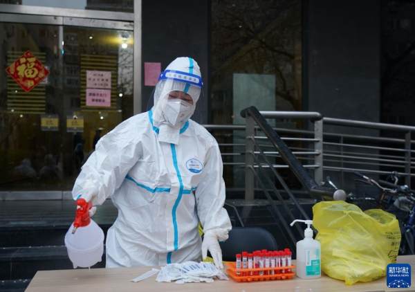 4月7日,在北京市海淀区北太平庄街道今典花园小区,医护人员为小区居民进行核酸采样。