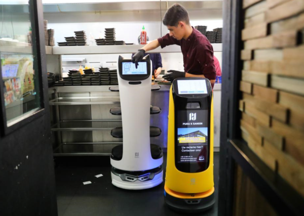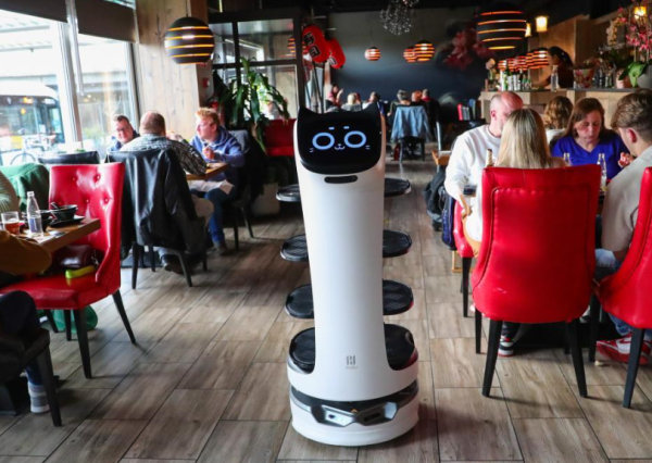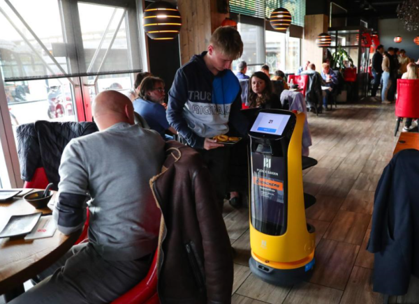 4月9日,机器人“贝拉”在比利时东佛兰德省圣尼克拉斯市的“美味”餐厅送餐。