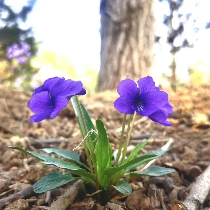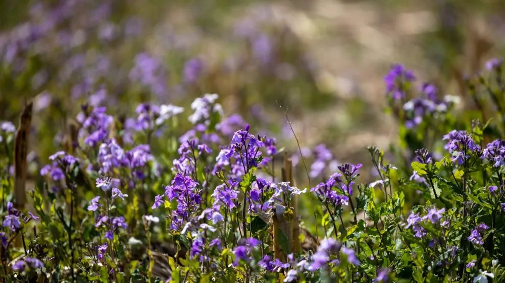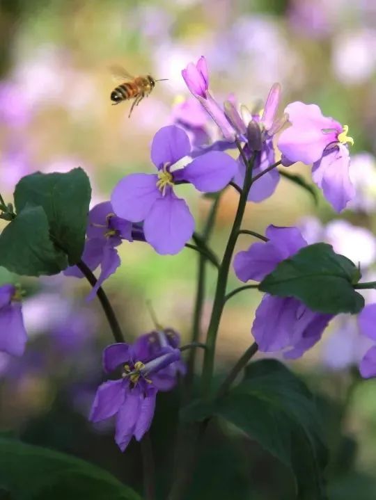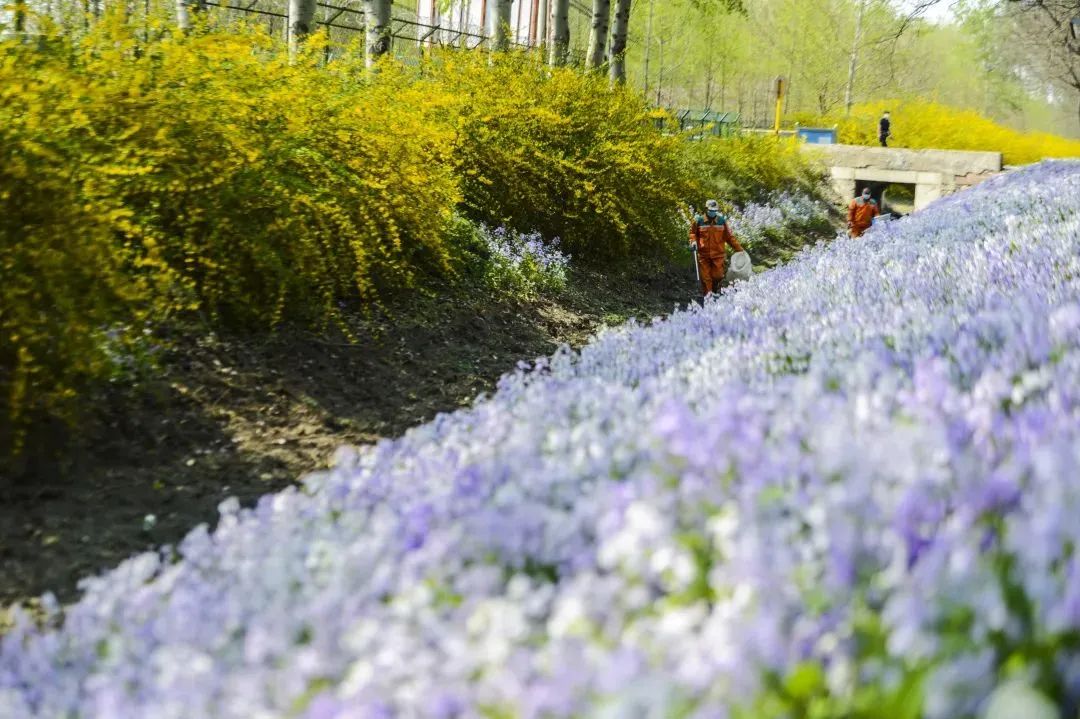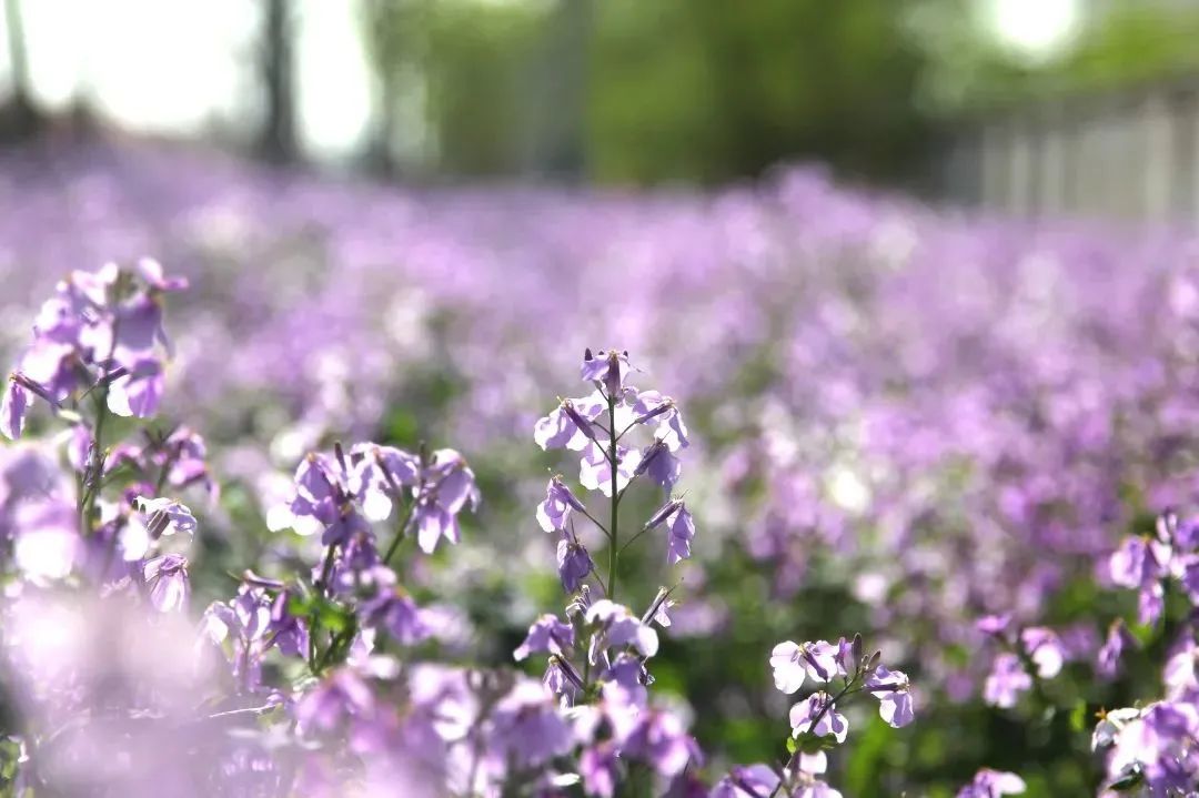 紫色的花朵,在春风中摇曳,小簇花群格外娇嫩,路人驻足打卡拍照。