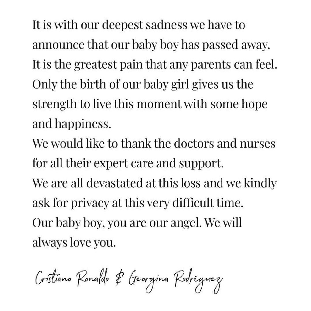 C罗和乔治娜共同署名发文写道:“我们怀着最深的悲伤向大家宣布,我们的男婴夭折了。这对于父母来说是最大的痛苦,只有女婴的出生能带给我们一些力量,能让我们带着希望和快乐度过这一时刻。”