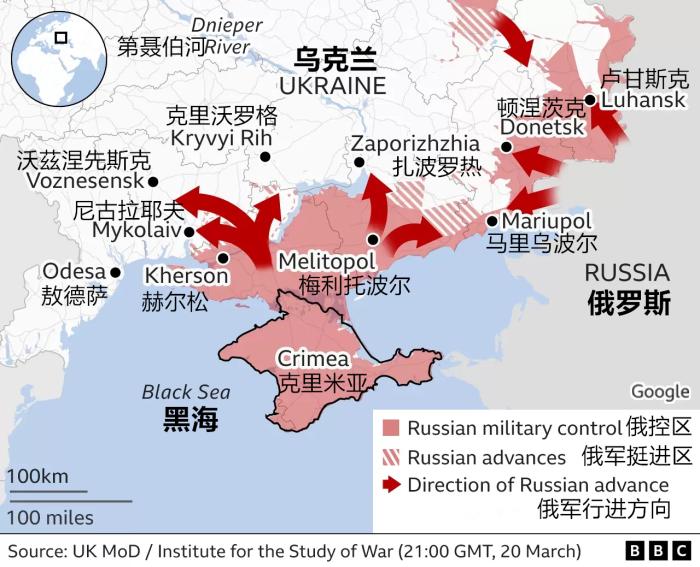 3月2日起,赫尔松市已被俄武装力量完全控制。此外,过去三天里,俄军对基辅及周边军工厂等设施,发动数次袭击。4月18日至19日,顿涅茨克前线、东北部哈尔科夫、南部尼古拉耶夫、东南部扎波罗热等地,据报都响起爆炸声。
