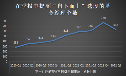 通联数据显示,2022年一季度,全市场共有633只公募基金的季报,在报告期内的投资策略和运作分析中,提到“自下而上”的选股方法。而在2021年四季报中,出现这一说法基金共有770只。更在更早的2020年一季度,只有281只基金提及这一策略。